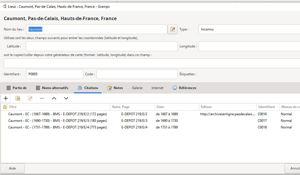 Depuis quelques temps je créais une note par commune, “Source concernant la commune de Caumont”, et je fais un lien vers l’enregistrement de lieu correspondant. Les références de la note fournissent toutes les sources liées. Un ctrl-clic sur le lien ouvre le lieu de la commune et les références du lieu montre qu’il existe une note de sources associées à celle-ci.